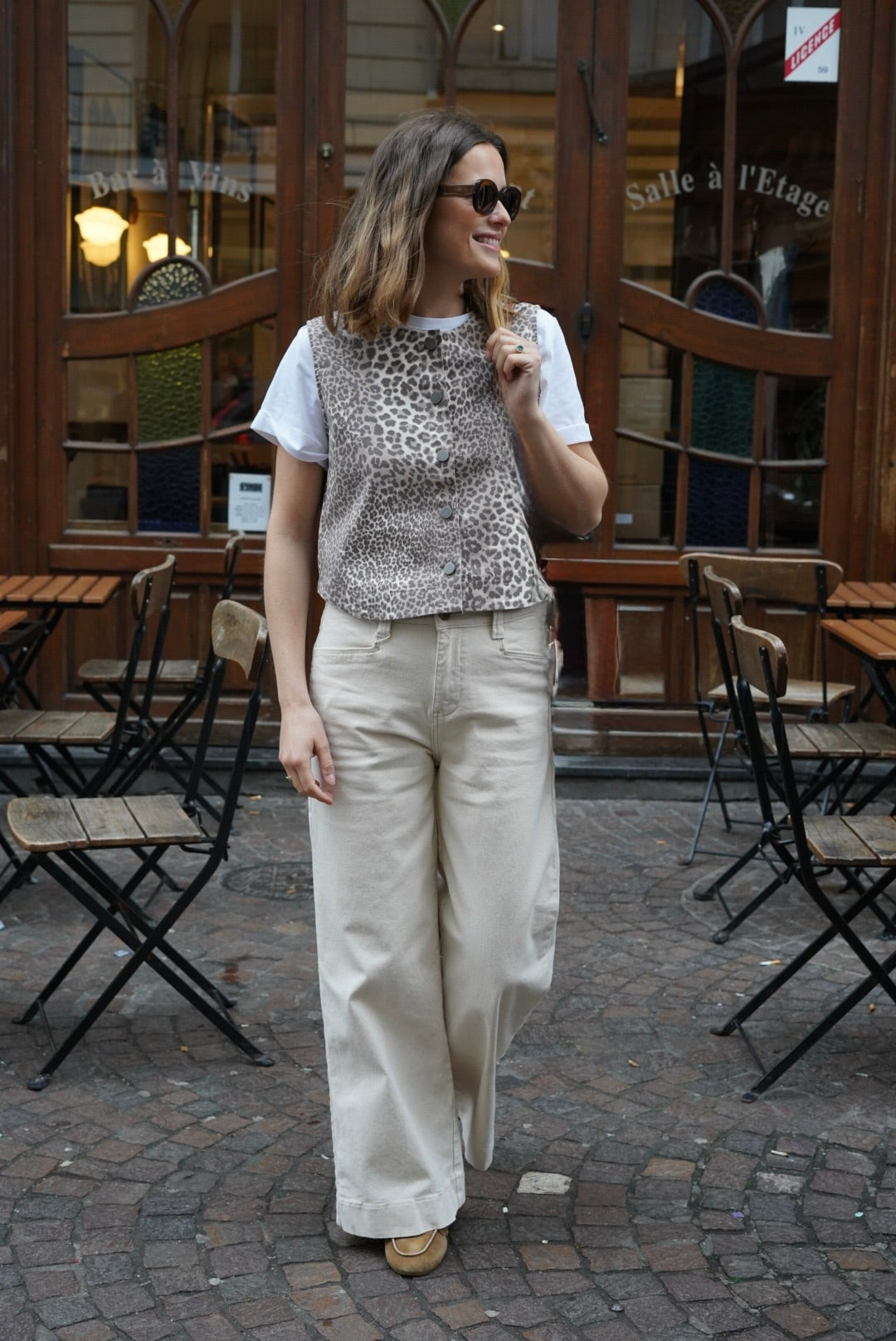 Osez le look sauvage avec le top sans manches Raoul en denim à imprimé léopard. A porter seul ou superposé selon vos envies.