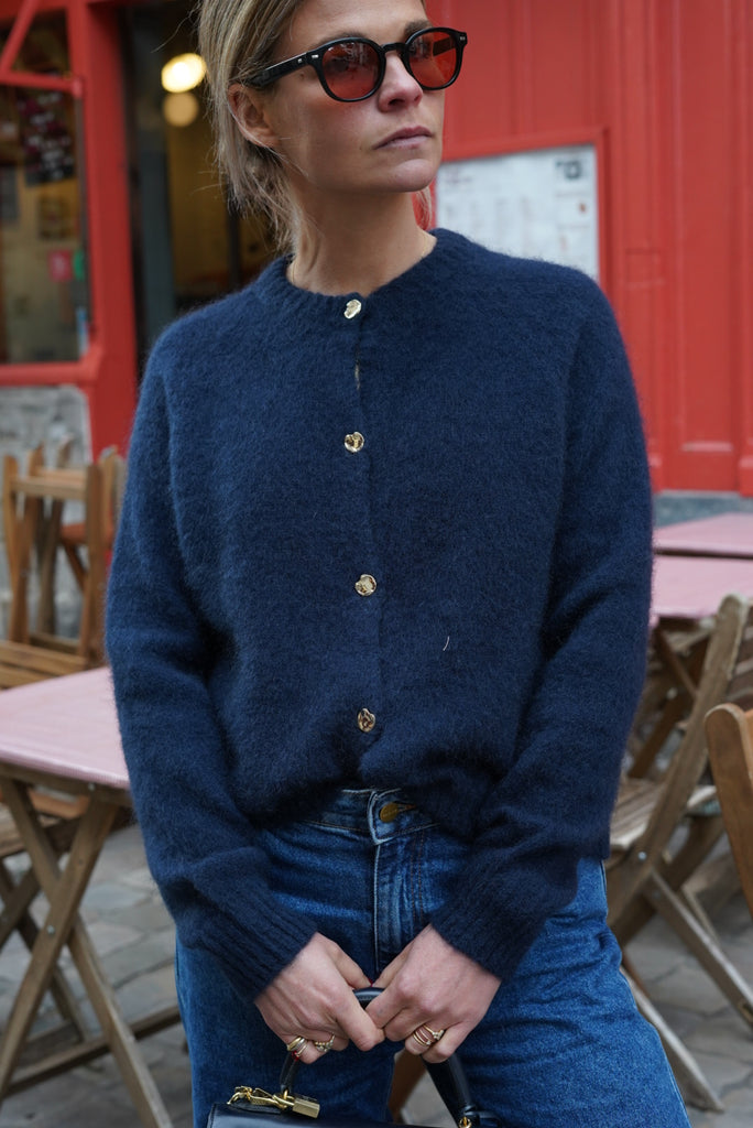 Ce gilet bleu marine tout doux en maille duveteuse vous enveloppe de chaleur pour un look simple, élégant et sans effort : un essentiel du quotiden.