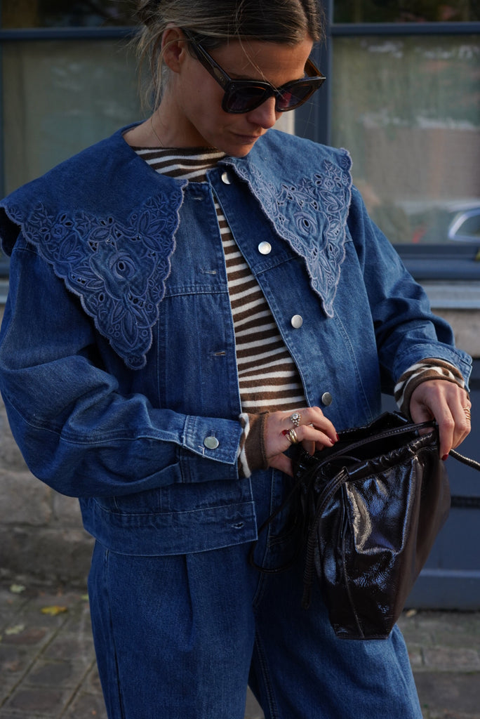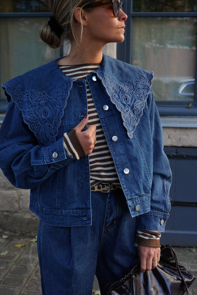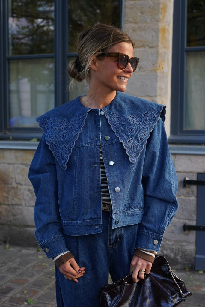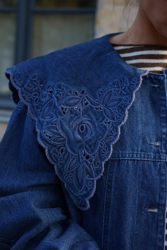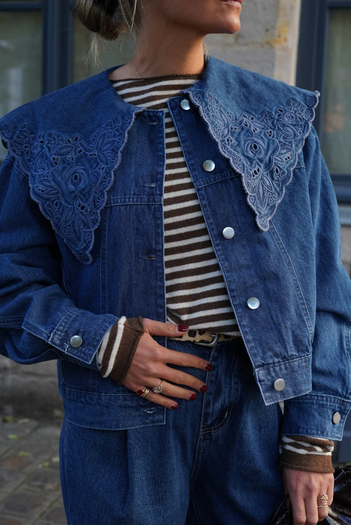 Apportez une touche d’originalité à vos looks du quotidien avec notre veste Simone qui se distingue grâce à son maxi col brodé.