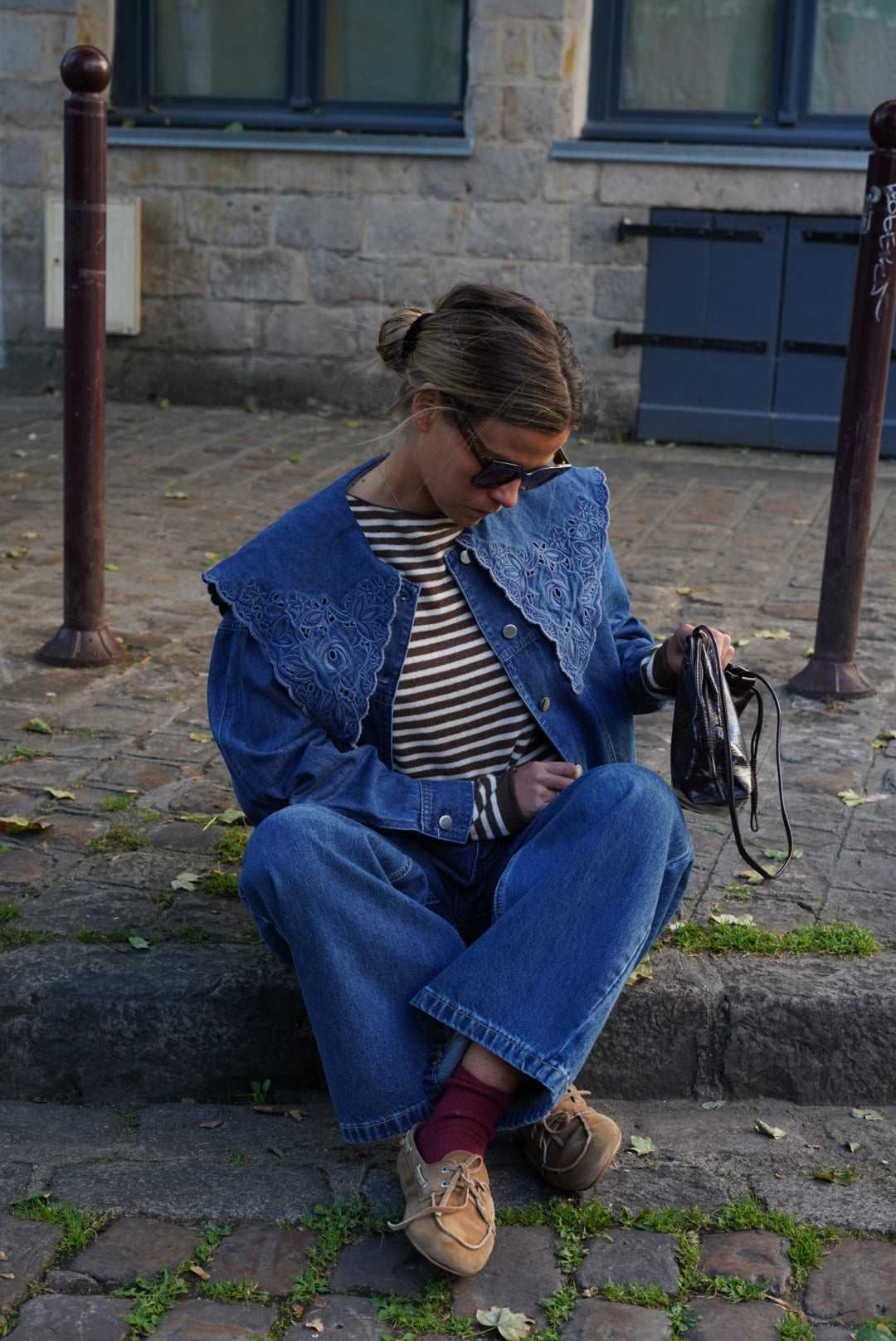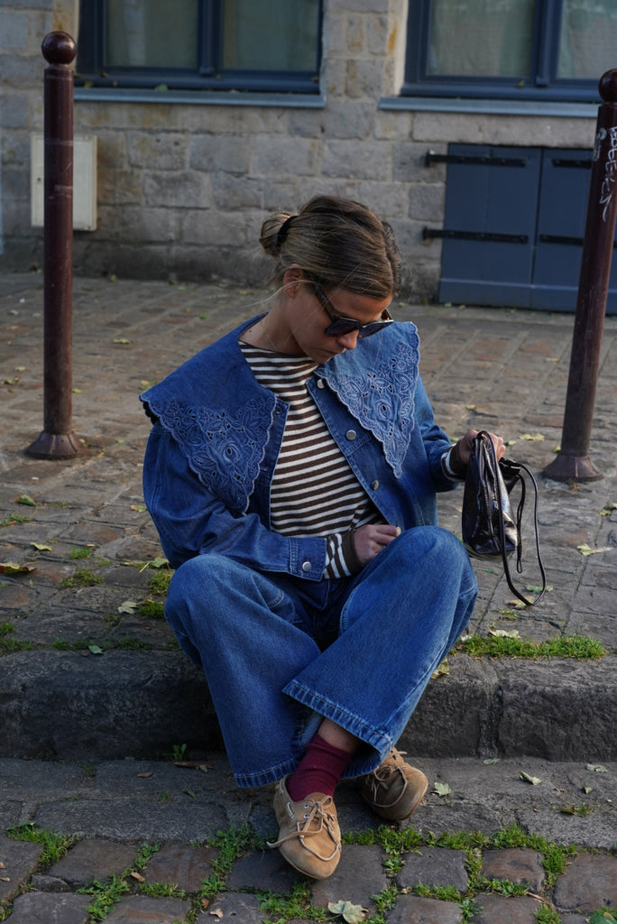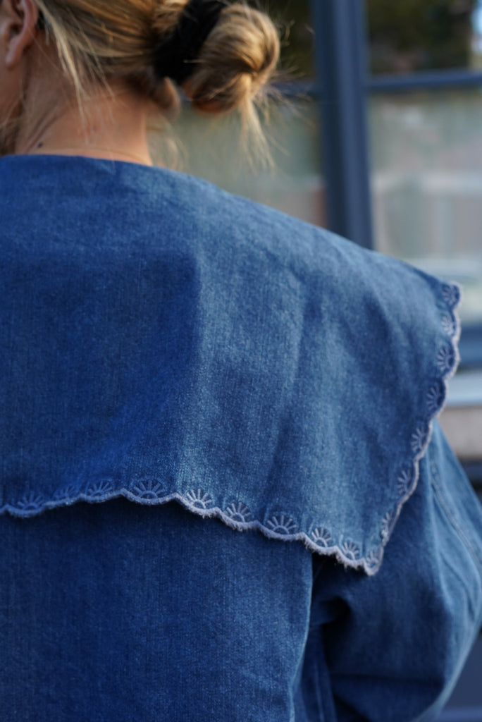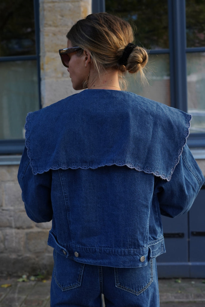 Apportez une touche d’originalité à vos looks du quotidien avec notre veste Simone qui se distingue grâce à son maxi col brodé.