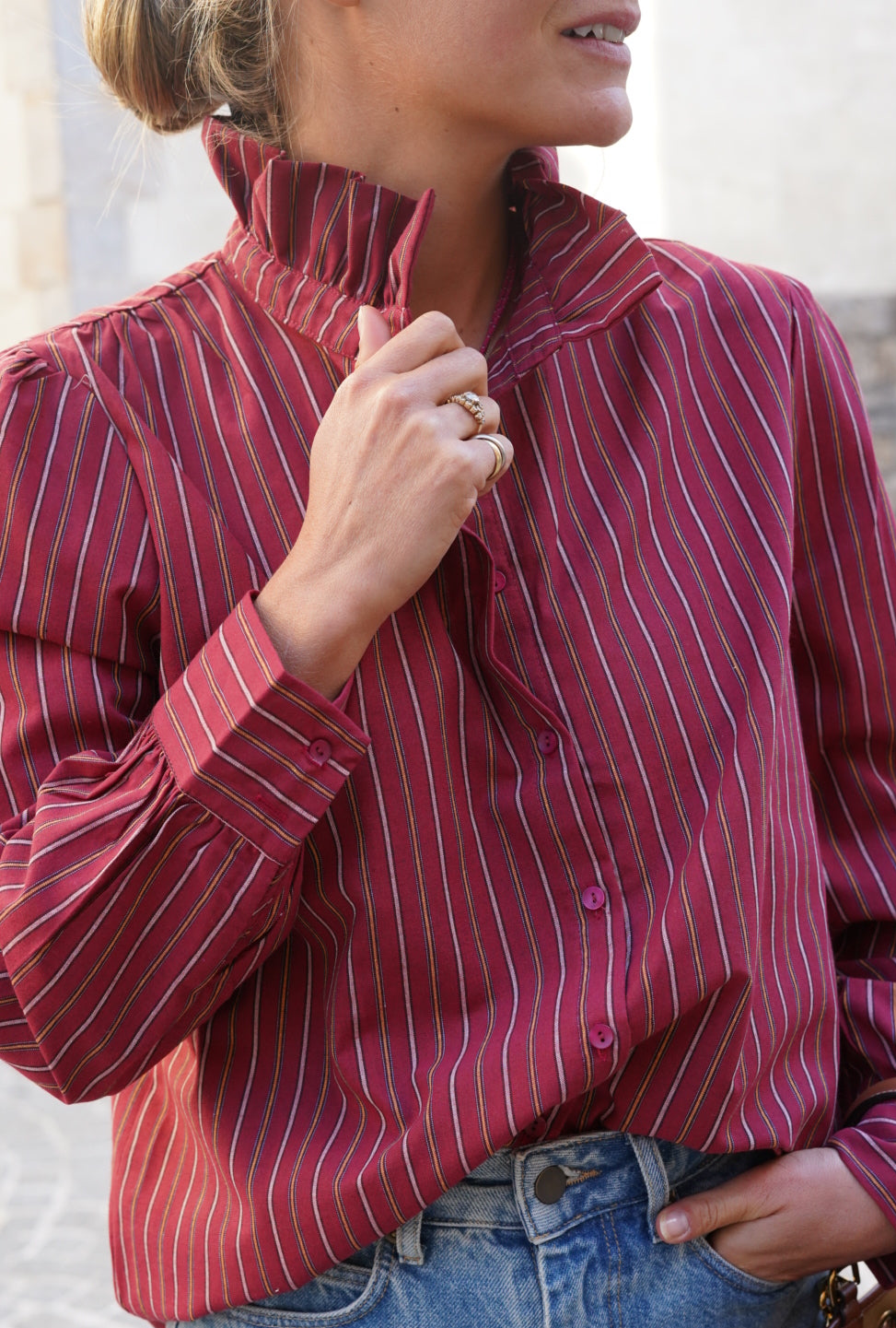 La chemise Félicie se distingue par son style unique et intemporel grâce à sa couleur chaude et élégante, ses fines rayures modernes et délicates et son col montant volanté qui lui confère un charme raffiné et féminin.
